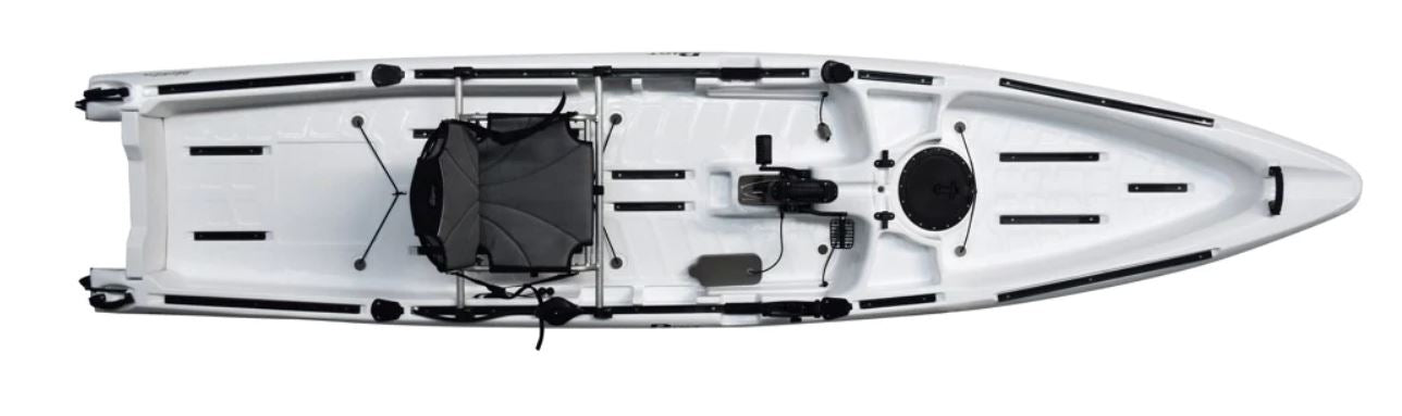 The New Mako 14 was created with big adventures in mind. This pedal kayak was designed to carry a ton of gear and perform well on flat water or big water. Perfect platform for fishing, photography or diving with its open stern transom. Our Impulse Drive pedal unit is the simplest and the lightest on the market, open to the elements yet requiring no special maintenance. Our fully adjustable comfort seat with a high supportive back, is quick to dry. The rudder steering box can be placed on either side to suit your preference. The Mako series is available in 10’, 12’ and 14’ models with more to come.