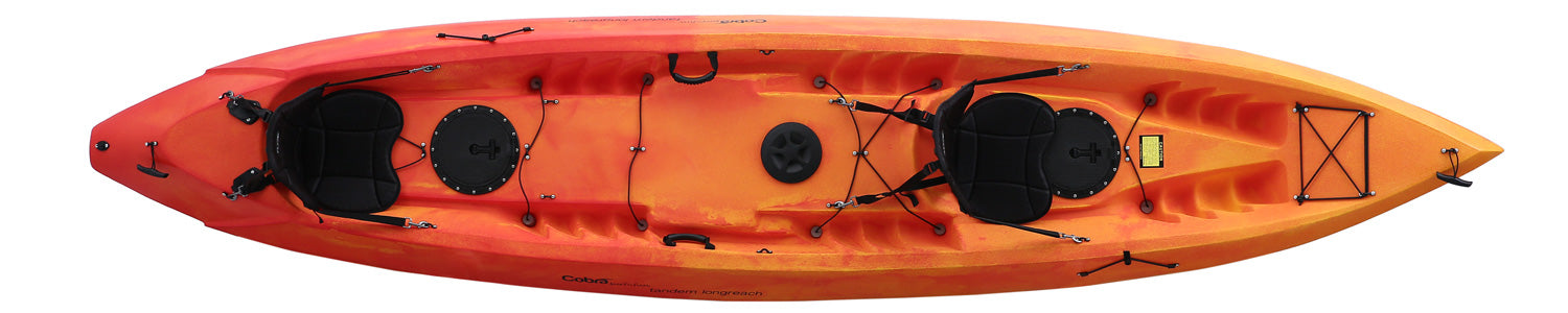 The Cobra Tandem Long Reach is an excellent extended range large kayak with two main seating positions and a extended central deck. This huge flat deck provides tons of storage both above and below the deck. Alternatively there is plenty of room for a 3rd adult to sit comfortably in the center seating position. At 35″ wide, there is loads of stability, yet it is easy to paddle and maneuver. With it’s two flushmount rod holders this is also the perfect 2 person fishing kayak.